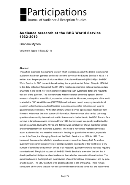 "This article examines the changing ways in which intelligence about the BBC’s international audiences has been gathered and used since the advent of the Empire Service in 1932. It is written from the perspective of a former Head of Audience Research (1982-96) at the BBC World Service. In BBC domestic broadcasting, the appointment of Robert Silvey in 1936 led to the daily collection throughout the UK of the most comprehensive national audience data anywhere in the world. For international broadcasting such systematic detail and regularity was out of the question. The listeners were widely scattered and thinly spread. Survey research of any kind was difficult, expensive or impossible. Moreover, many parts of the world to which the BBC World Service (BBCWS) broadcast were closed to any systematic local research, either because no local facilities to do research existed or because of legal or governmental prohibitions. At the start of BBC Empire Service spontaneous feedback from listeners’ letters was the main source of information. Research was also carried out using questionnaires sent by international mail to listeners who had written to the BBC. Face to face surveys in target areas were conducted from 1944, but coverage was patchy and limited by lack of resources. During the 1970s and 1980s it was conclusively shown that letter writers are unrepresentative of the whole audience. The need to have more representative data about audiences led to a massive increase in funding for quantitative research, especially under John Tusa, the Managing Director of the World Service from 1986 to 1992. Tusa increased the amount available to spend on research more than twenty-fold. As well as quantitative research using surveys of adult populations in all parts of the world (only a tiny number of countries today remain closed to all research) qualitative work is now also regularly commissioned. The global success of the BBC World Service is a result of the fact that it developed better intelligence about audiences than all other international broadcasters." (Abstract)