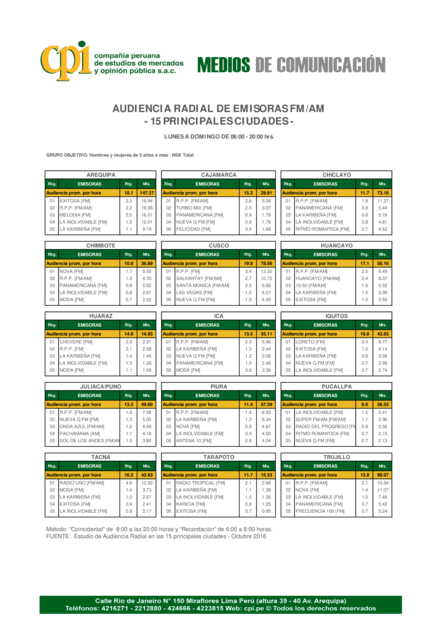 Audiencia radial de emisoras FM/AM: 15 principales ciudades [octubre]
