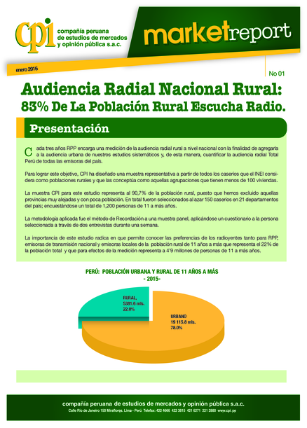 "El 83,1% de las personas de 11 a más años a nivel nacional rural escuchan radio por lo menos una vez a la semana y lo hacen principalmente a través de emisoras locales de FM y AM, alcanzando estas emisoras al 69,6% de la población rural con 12 horas en promedio de escucha semanal, este mayor alcance es debido a las emisoras de centros poblados urbanos que llegan a los caseríos rurales. Las emisoras de transmisión nacional alcanzan al 38.2% de la población rural con 9 horas de escucha semanal." (Página 2)