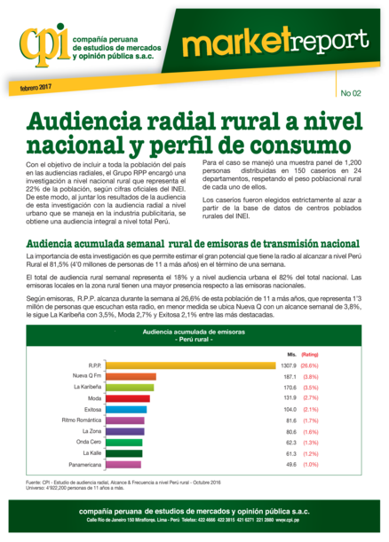 "Con el objetivo de incluir a toda la población del país en las audiencias radiales, el Grupo RPP encargó una investigación a nivel nacional rural que representa el 22% de la población, según cifras oficiales del INEI. De este modo, al juntar los resultados de la audiencia de esta investigación con la audiencia radial a nivel urbano que se maneja en la industria publicitaria, se obtiene una audiencia integral a nivel total Perú. Para el caso se manejó una muestra panel de 1,200 personas distribuidas en 150 caseríos en 24 departamentos, respetando el peso poblacional rural de cada uno de ellos. Los caseríos fueron elegidos estrictamente al azar a partir de la base de datos de centros poblados rurales del INEI. La importancia de esta investigación es que permite estimar el gran potencial que tiene la radio al alcanzar a nivel Perú Rural el 81,5% (4’0 millones de personas de 11 a más años) en el término de una semana. El total de audiencia rural semanal representa el 18% y a nivel audiencia urbana el 82% del total nacional. Las emisoras locales en la zona rural tienen una mayor presencia respecto a las emisoras nacionales. Según emisoras, R.P.P. alcanza durante la semana al 26,6% de esta población de 11 a más años, que representa 1’3 millón de personas que escuchan esta radio, en menor medida se ubica Nueva Q con un alcance semanal de 3,8%, le sigue La Karibeña con 3,5%, Moda 2,7% y Exitosa 2,1% entre las más destacadas." (Página 1)