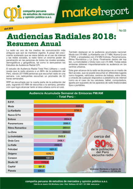 "El estudio de audiencia radial total Perú (urbano y rural) revela que la radio alcanza a un 89% de la población del Perú, siendo 22,4 milliones de personas que escuchan radio en una semana. Los radioyentes escuchan un promedio de 22 horas semanales. RPP es escuchada por la cuarta parte de la población del país, logrando 6,3 milliones de las escuchas a la semana, penetración que logra alcanzar tanto al área urbana como al rural." (Página 1)
