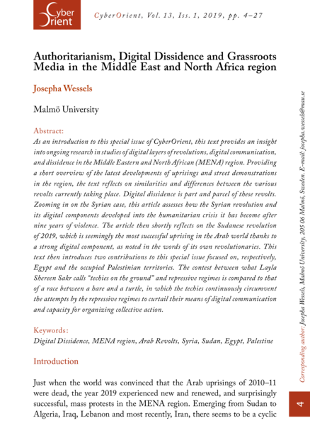 "As an introduction to this special issue of CyberOrient, this text provides an insight into ongoing research in studies of digital layers of revolutions, digital communication, and dissidence in the Middle Eastern and North African (MENA) region. Providing a short overview of the latest developments of uprisings and street demonstrations in the region, the text reflects on similarities and differences between the various revolts currently taking place. Digital dissidence is part and parcel of these revolts. Zooming in on the Syrian case, this article assesses how the Syrian revolution and its digital components developed into the humanitarian crisis it has become after nine years of violence. The article then shortly reflects on the Sudanese revolution of 2019, which is seemingly the most successful uprising in the Arab world thanks to a strong digital component, as noted in the words of its own revolutionaries. This text then introduces two contributions to this special issue focused on, respectively, Egypt and the occupied Palestinian territories. The contest between what Layla Shereen Sakr calls “techies on the ground” and repressive regimes is compared to that of a race between a hare and a turtle, in which the techies continuously circumvent the attempts by the repressive regimes to curtail their means of digital communication and capacity for organizing collective action." (Abstract)
