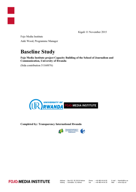 "This baseline study has been conducted within the inception phase of the project Capacity Building of the School of Journalism and Communication, to support the School of Journalism and Communication (SJC) under the University of Rwanda. The findings rest mainly on eight brief background papers analysing the media context and the environment in which SJC operates. The key outputs consist of proposed logical framework for the programme including indicators and baseline values under each of the four outcomes. The system for measuring and evaluating of the progress under the indicators throughout the four-year programme is a second important output of this study." (Executive summary)