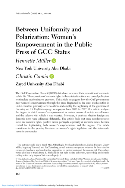 "The Gulf Cooperation Council (GCC) states have increased their promotion of women in public life. The expansion of women’s rights in these states functions as a central policy tool to stimulate modernization processes. This article investigates how the Gulf governments steer women’s empowerment through the press. Regulated by the state, media outlets in GCC countries primarily serve to affirm and amplify the legitimacy of the government. Focusing on 15 English-language newspapers from 2008 to 2017, this article analyzes the degree to which women’s empowerment in various arenas of society was addressed and the valence with which it was reported. Moreover, it analyzes whether foreign and domestic news were addressed differently. The article finds that once nondemocracies focus on women’s rights, positive media portrayals, especially of domestic news, become central for legitimizing both women’s empowerment and the regime. The article contributes to the growing literature on women’s rights legislation and the state-media nexus in autocracies." (Abstract)