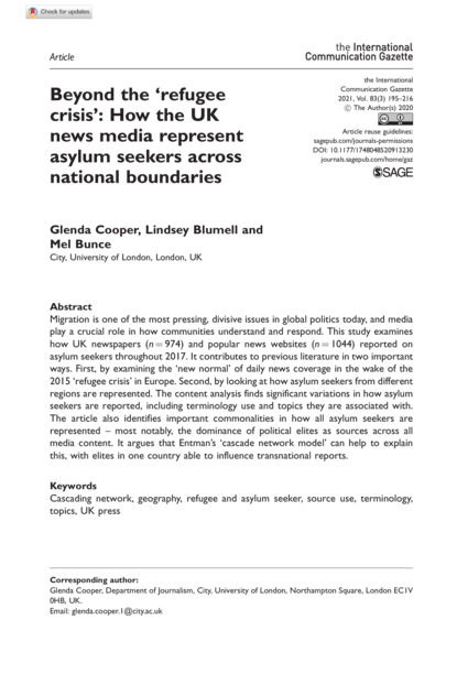 "Migration is one of the most pressing, divisive issues in global politics today, and media play a crucial role in how communities understand and respond. This study examines how UK newspapers (n=974) and popular news websites (n=1044) reported on asylum seekers throughout 2017. It contributes to previous literature in two important ways. First, by examining the ‘new normal’ of daily news coverage in the wake of the 2015 ‘refugee crisis’ in Europe. Second, by looking at how asylum seekers from different regions are represented. The content analysis finds significant variations in how asylum seekers are reported, including terminology use and topics they are associated with. The article also identifies important commonalities in how all asylum seekers are represented – most notably, the dominance of political elites as sources across all media content. It argues that Entman’s ‘cascade network model’ can help to explain this, with elites in one country able to influence transnational reports." (Abstract)