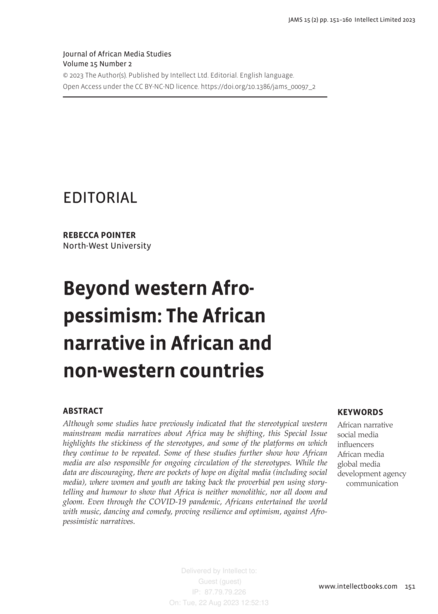 "Although some studies have previously indicated that the stereotypical western mainstream media narratives about Africa may be shifting, this Special Issue highlights the stickiness of the stereotypes, and some of the platforms on which they continue to be repeated. Some of these studies further show how African media are also responsible for ongoing circulation of the stereotypes. While the data are discouraging, there are pockets of hope on digital media (including social media), where women and youth are taking back the proverbial pen using storytelling and humour to show that Africa is neither monolithic, nor all doom and gloom. Even through the COVID-19 pandemic, Africans entertained the world with music, dancing and comedy, proving resilience and optimism, against Afropessimistic narratives." (Abstract)