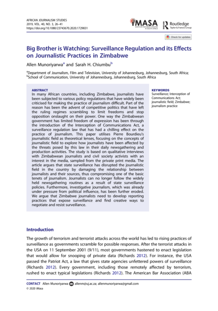 "In many African countries, including Zimbabwe, journalists have been subjected to various policy regulations that have widely been criticised for making the practice of journalism difficult. Part of the reason has been the advent of competitive politics that have left the ruling regimes scrambling to limit freedoms and stopopposition onslaught on their power. One way the Zimbabwean government has limited freedom of expression has been through the introduction of the Interception of Communications Act, a surveillance regulation law that has had a chilling effect on the practice of journalism. This paper utilises Pierre Bourdieu’s journalistic field as theoretical lenses, focusing on the concepts of journalistic field to explore how journalists have been affected by the threats posed by this law in their daily newsgathering and production activities. The study is based on qualitative interviews with Zimbabwean journalists and civil society activists with an interest in the media, sampled from the private print media. The article argues that state surveillance has disrupted the journalistic field in the country by damaging the relationship between journalists and their sources, thus compromising one of the basic tenets of journalism. Journalists can no longer follow the widely held newsgathering routines as a result of state surveillance policies. Furthermore, investigative journalism, which was already under pressure from political influence, has been further eroded. We argue that Zimbabwe journalists need to develop reporting practices that expose surveillance and find creative ways to negotiate and resist surveillance." (Abstract)