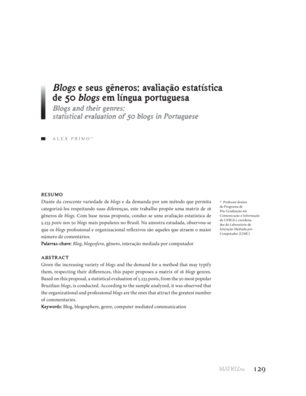 "Diante da crescente variedade de blogs e da demanda por um método que permita categorizá-los respeitando suas diferenças, este trabalho propõe uma matriz de 16 gêneros de blogs. Com base nessa proposta, conduz-se uma avaliação estatística de 5.233 posts nos 50 blogs mais populares no Brasil. Na amostra estudada, observou-se que os blogs profi ssional e organizacional refl exivos são aqueles que atraem o maior número de comentários." (Resumo, página 129)