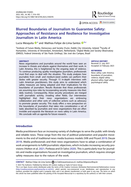 "News organizations and journalists around the world have seen an increase in threats and attacks against themselves and their work. In Latin America, this is heightened by the ongoing state of violence. To continue producing quality investigative journalism, professionals must find ways to deal with the situation. This study analyzes how journalists from small- and medium-sized outlets can perform their duties with greater security. Through 15 in-depth interviews with Latin American practitioners, this study aims to understand which safety measures are being adopted and their implications for the boundaries of journalism. Results illustrate that these professionals are assuming new roles by incorporating security measures into their daily routines. Consequently, these security procedures are merged with journalistic activity, invading other fields. Our interviewees highlighted that their news organizations are embracing collaboration and other sorts of collective actions such as advocacy to promote greater security. This study offers a new perspective on the boundaries of journalism that takes into consideration a set of tasks absorbed by journalists and news organizations that are often invisible and expands the literature on news safety in Latin America. We conclude with an agenda for future research." (Abstract)