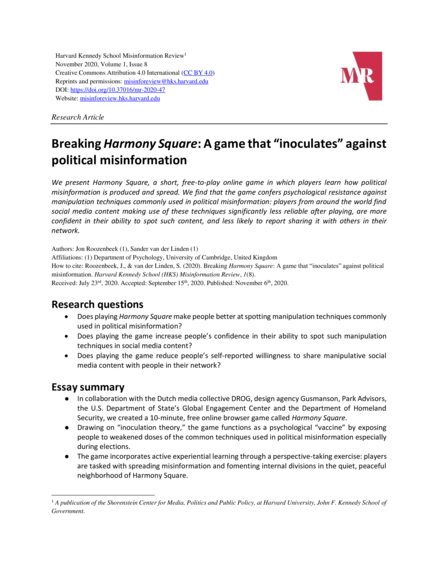 "We present Harmony Square, a short, free-to-play online game in which players learn how political misinformation is produced and spread. We find that the game confers psychological resistance against manipulation techniques commonly used in political misinformation: players from around the world find social media content making use of these techniques significantly less reliable after playing, are more confident in their ability to spot such content, and less likely to report sharing it with others in their network." (Abstract)