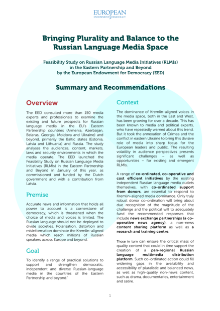 "Recommendations revolve around five building blocks of a co-ordinated strategy that calls for: 1. A regional news hub for the Russian language that embodies the values of fairness, accuracy and watchdog reporting, and builds a network of partners to leverage high-quality news content to wider audiences across platforms [...] 2. A content sharing platform (“content factory”) to encourage the production and distribution of highquality programming on television and online, with particular emphasis on content that reflects local issues and local lives [...] 3. A centre for media excellence in the Russian language that co-ordinates the work of governments, NGOs and educational institutions in ongoing market research and media monitoring, media literacy programmes, professional training and peer-to-peer exchanges. 4. Alongside the three main building blocks, a basket fund should be established to provide a critical mass of funding for the building blocks [...] 5. On top of the three main building blocks should sit a multimedia distribution platform that guarantees a degree of “buy in” and ensures content generated by the news exchange and content factory reaches the widest possible audience." (Page 4)