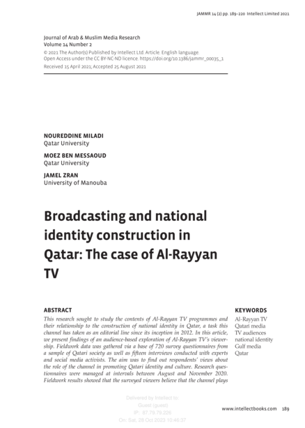 "This research sought to study the contents of Al-Rayyan TV programmes and their relationship to the construction of national identity in Qatar, a task this channel has taken as an editorial line since its inception in 2012. In this article, we present findings of an audience-based exploration of Al-Rayyan TV's viewership. Fieldwork data was gathered via a base of 720 survey questionnaires from a sample of Qatari society as well as fifteen interviews conducted with experts and social media activists. The aim was to find out respondents' views about the role of the channel in promoting Qatari identity and culture. Research questionnaires were managed at intervals between August and November 2020. Fieldwork results showed that the surveyed viewers believe that the channel plays a significant role in preserving Qatari national culture and heritage. However, when it comes to rating Qatari TV channels in order of importance, respondents' favourite TV broadcaster in terms of news and current affairs programmes was Al Jazeera, followed by beIN Sports, Qatar TV, Al-Rayyan TV and finally Al Kass. Research findings also reveal an evident trend among young Qataris and professionals who find social media networks the most convenient platforms to view and share content from Al-Rayyan TV. People watch video clips from the most popular programmes, such as Al-Sabah Rabah, Umm Rashid, Taraheeb and In the Shadows of Doha, among others, which they receive via Twitter, Instagram and Facebook. However, concerns via-à-vis Al-Rayyan TV's repetitive content and a programme schedule that does not include much entertainment content cannot be missed from viewers' responses. The dwindling popularity of the channel among Qatari youth is perceived as one such result of its inability to transform itself in the age of digital explosion." (Abstract)