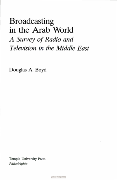 "Against a background of the historical, religious, geographical, climatic, political, economic and linguistic factors that make radio and television unique as they affect its development, Boyd discusses broadcasting in the Arab League countries - Egypt, the Sudan, Lebanon, Syria, Jordon, North Yemen, South Yemen, Iraq, Kuwait, Saudi Arabia, Bahrain, Qatar, the United Arab Emirates, Oman, Algeria, Libya, Morocco, and Tunisia (omitting Somalia and Mauritania). Egypt and Saudi Arabia are covered in more detail than the other countries. The bulk of the book is taken up with these individual descriptions; an introduction discusses Arab broadcasting in general - its developments, trends and constraints - and concluding sections are concerned with international radio broadcasting in Arabic and with problems within Arab broadcasting. There is a bibliography of printed sources of various kinds and a listing of the author's personal communications. Index." (Eleanor Blum, Frances G. Wilhoit: Mass media bibliography. 3rd ed. Urbana: University of Illinois Press, 1990 Nr. 522)