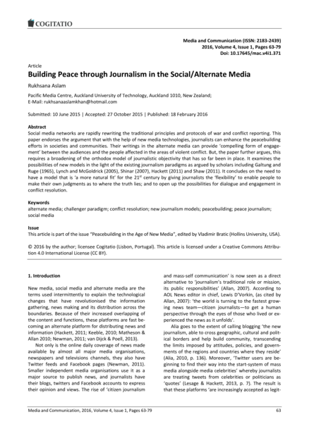 "Social media networks are rapidly rewriting the traditional principles and protocols of war and conflict reporting. This paper endorses the argument that with the help of new media technologies, journalists can enhance the peacebuilding efforts in societies and communities. Their writings in the alternate media can provide ‘compelling form of engage-ment’ between the audiences and the people affected in the areas of violent conflict. But, the paper further argues, this requires a broadening of the orthodox model of journalistic objectivity that has so far been in place. It examines the possibilities of new models in the light of the existing journalism paradigms as argued by scholars including Galtung and Ruge (1965), Lynch and McGoldrick (2005), Shinar (2007), Hackett (2011) and Shaw (2011). It concludes on the need to have a model that is ‘a more natural fit’ for the 21st century by giving journalists the ‘flexibility’ to enable people to make their own judgments as to where the truth lies; and to open up the possibilities for dialogue and engagement in conflict resolution." (Abstract)