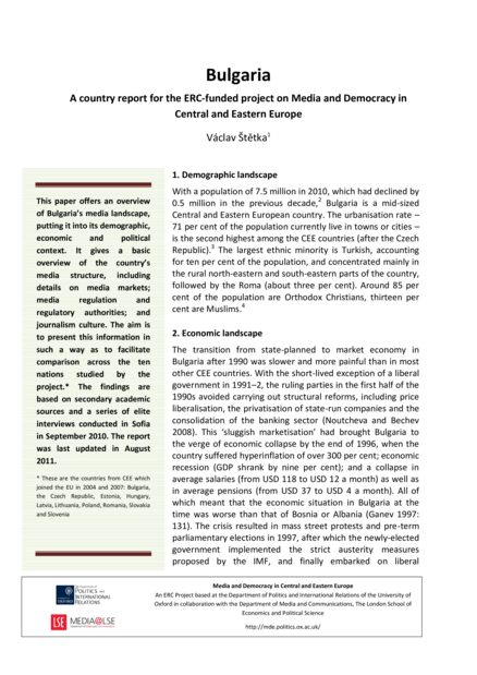 "This paper offers an overview of Bulgaria’s media landscape, putting it into its demographic, economic and political context. It gives a basic overview of the country’s media structure, including details on media markets; media regulation and regulatory authorities; and journalism culture." (Page 1)