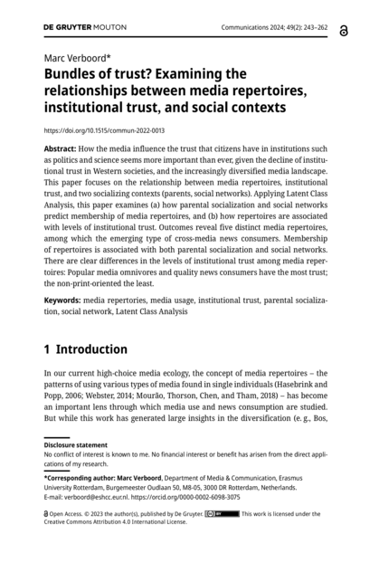 "How the media influence the trust that citizens have in institutions such as politics and science seems more important than ever, given the decline of institutional trust in Western societies, and the increasingly diversified media landscape. This paper focuses on the relationship between media repertoires, institutional trust, and two socializing contexts (parents, social networks). Applying Latent Class Analysis, this paper examines (a) how parental socialization and social networks predict membership of media repertoires, and (b) how repertoires are associated with levels of institutional trust. Outcomes reveal five distinct media repertoires, among which the emerging type of cross-media news consumers. Membership of repertoires is associated with both parental socialization and social networks. There are clear differences in the levels of institutional trust among media repertoires: Popular media omnivores and quality news consumers have the most trust; the non-print-oriented the least." (Abstract)