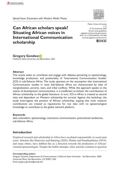 "This article seeks to contribute and engage with debates pertaining to epistemology, knowledge production, and positionality of ‘International Communication Studies’ (ICS) in sub-Saharan Africa. The study operates on the assumption that International Communication studies in most Sub-Saharan Africa are characterized by tales of marginalization, poverty, wars, and tribal conflicts. While this approach speaks to the notion of development communication, it is insufficient to bolster the contributions of African scholarship to the global literature. In turn, ICS in Africa is treated as second class and dependent on Western scholarship for survival. Against this backdrop, the study interrogates the position of African scholarship, arguing that most research contributions are treated as repositories for raw data with no epistemological knowledge to contribute to the global network platform." (Abstract)