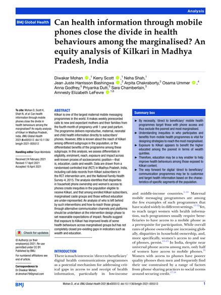 "Kilkari is one of the largest maternal mobile messaging programmes in the world. It makes weekly prerecorded calls to new and expectant mothers and their families from the fourth month of pregnancy until 1-year post partum. The programme delivers reproductive, maternal, neonatal and child health information directly to subscribers’ phones. However, little is known about the reach of Kilkari among different subgroups in the population, or the differentiated benefits of the programme among these subgroups. In this analysis, we assess differentials in eligibility, enrolment, reach, exposure and impact across well-known proxies of socioeconomic position—that is, education, caste and wealth. Data are drawn from a randomised controlled trial (RCT) in Madhya Pradesh, India, including call data records from Kilkari subscribers in the RCT intervention arm, and the National Family Health Survey-4, 2015. The analysis identifies that disparities in household phone ownership and women’s access to phones create inequities in the population eligible to receive Kilkari, and that among enrolled Kilkari subscribers, marginalised caste groups and those without education are under-represented. An analysis of who is left behind by such interventions and how to reach those groups through alternative communication channels and platforms should be undertaken at the intervention design phase to set reasonable expectations of impact. Results suggest that exposure to Kilkari has improved levels of some health behaviours across marginalised groups but has not completely closed pre-existing gaps in indicators such as wealth and education." (Abstract)