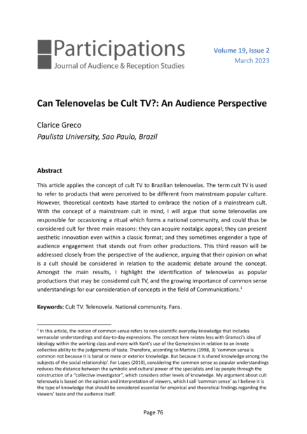 "This article applies the concept of cult TV to Brazilian telenovelas. The term cult TV is used to refer to products that were perceived to be different from mainstream popular culture. However, theoretical contexts have started to embrace the notion of a mainstream cult. With the concept of a mainstream cult in mind, I will argue that some telenovelas are responsible for occasioning a ritual which forms a national community, and could thus be considered cult for three main reasons: they can acquire nostalgic appeal; they can present aesthetic innovation even within a classic format; and they sometimes engender a type of audience engagement that stands out from other productions. This third reason will be addressed closely from the perspective of the audience, arguing that their opinion on what is a cult should be considered in relation to the academic debate around the concept. Amongst the main results, I highlight the identification of telenovelas as popular productions that may be considered cult TV, and the growing importance of common sense understandings for our consideration of concepts in the field of Communications." (Abstract)