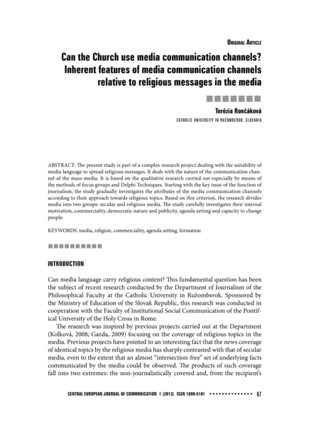 "The present study is part of a complex research of media language to spread religious messages. It deals with the nature of the communication channel of the mass-media. It is based on the qulitative research carried out especially by means of the methods of focus groups and Delphi Techniques. Starting with the key issue of the function of journalism, the study gradually investigates the attributes of the media communication channels according to their approach towards religious topics. Based on this criterion, the research divides media into two groups: secular and religious media. The study carefully investigates their internal motivation, commerciality, democratic nature and publicity, agenda setting and capacity to change people. (Abstract)