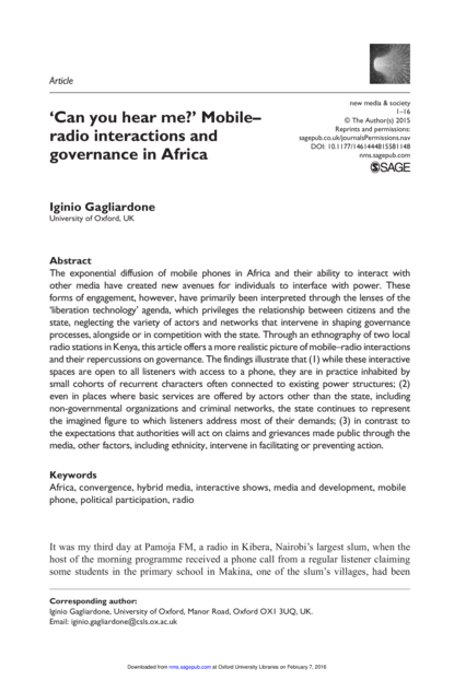 "The exponential diffusion of mobile phones in Africa and their ability to interact with other media have created new avenues for individuals to interface with power. These forms of engagement, however, have primarily been interpreted through the lenses of the ‘liberation technology’ agenda, which privileges the relationship between citizens and the state, neglecting the variety of actors and networks that intervene in shaping governance processes, alongside or in competition with the state. Through an ethnography of two local radio stations in Kenya, this article offers a more realistic picture of mobile–radio interactions and their repercussions on governance. The findings illustrate that (1) while these interactive spaces are open to all listeners with access to a phone, they are in practice inhabited by small cohorts of recurrent characters often connected to existing power structures; (2) even in places where basic services are offered by actors other than the state, including non-governmental organizations and criminal networks, the state continues to represent the imagined figure to which listeners address most of their demands; (3) in contrast to the expectations that authorities will act on claims and grievances made public through the media, other factors, including ethnicity, intervene in facilitating or preventing action." (Abstract)