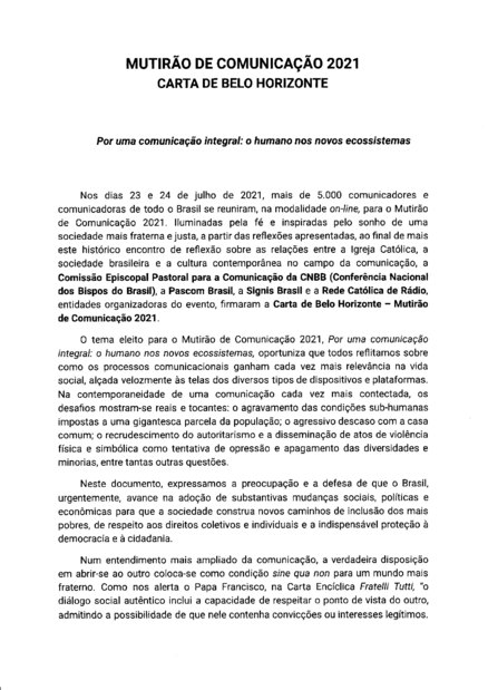 "Depois de dois dias de reflexões, espiritualidade, encontro e arte, dias 23 e 24 de julho, num encontro que reuniu mais de 5.000 comunicadores católicos de todo o Brasil, a 12ª segunda edição do Mutirão de Comunicação divulgou a Carta de Belo Horizonte, um documento que sintetiza os principais temas, questões e compromissos em torno de uma perspectiva de comunicação católica e cristã no país. A carta foi firmada pelas organizações que promoveram o Mutirão: Comunicação Episcopal Pastoral para a Comunicação da Conferência Nacional dos Bispos do Brasil (CNBB), a Pascom Brasil, a Signis Brasil e a Rede Católica de Rádio. O documento reforça que os processos comunicacionais ganham cada vez mais relevância na vida social, “alçados velozmente às telas dos diversos tipos de dispositivos e plataformas”. O texto fala também dos atos de violência física e simbólica como tentativa de opressão e apagamento das diversidades e minorias. Para superar os problemas enfrentados pelo Brasil, sobretudo os do âmbito da comunicação, a Carta de Belo Horizonte propõe um conceito de comunicação mais amplo, que passa pela “verdadeira disposição em abrir-se ao outro como condição essencial para um mundo mais fraterno." (https://www.cnbb.org.br, 26.7.2021)