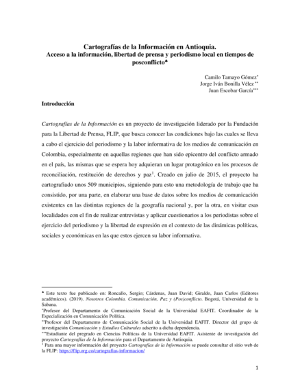 Cartografías de la Información en Antioquia: Acceso a la información, libertad de prensa y periodismo local en tiempos de posconflicto