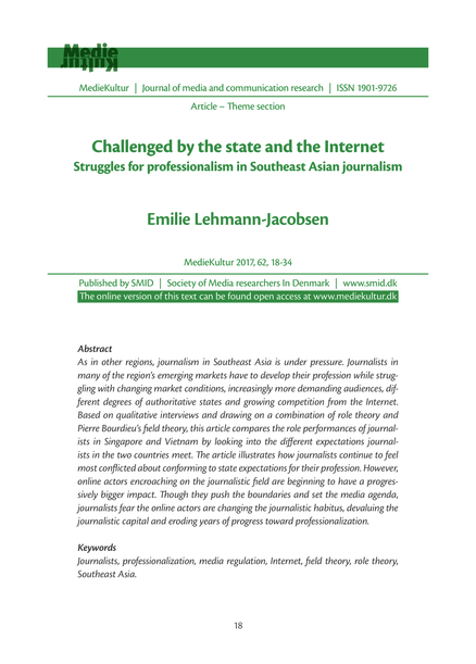 "As in other regions, journalism in Southeast Asia is under pressure. Journalists in many of the region’s emerging markets have to develop their profession while struggling with changing market conditions, increasingly more demanding audiences, different degrees of authoritative states and growing competition from the Internet. Based on qualitative interviews and drawing on a combination of role theory and Pierre Bourdieu’s field theory, this article compares the role performances of journalists in Singapore and Vietnam by looking into the different expectations journalists in the two countries meet. The article illustrates how journalists continue to feel most conflicted about conforming with the states’ expectations to their profession. However, online actors imposing on the journalistic field are beginning to have a progressively bigger impact. Though they push the boundaries and set the media agenda, journalists fear they are changing the journalistic habitus, devaluing the journalistic capital and eroding years’ worth of professionalization progress." (Abstract)