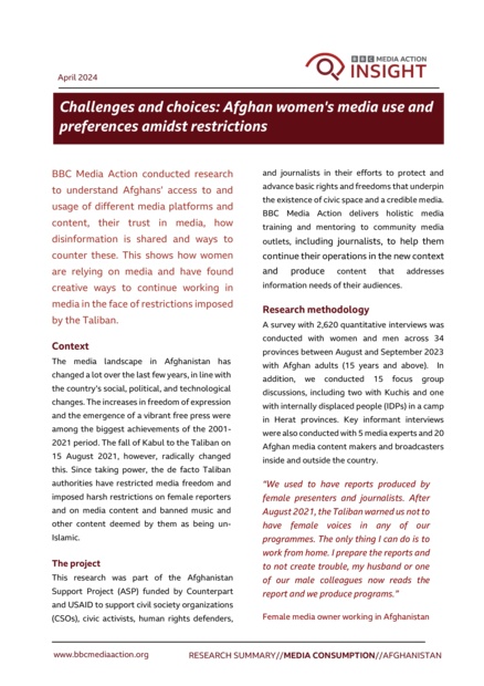 "While most adult Afghans have access to some form of media platform, only around one in three have access to internet, with less than half of mobile users owning a smartphone. Men exhibit higher usage of radio and internet compared to women (52% male vs 43% female for radio and 36% vs 29% for internet). Use of TV, however, is nearly identical among men and women. Men predominantly use media in the evenings between 7 to 10 pm, while women use media during the day, with an increase in women’s TV usage during daylight hours compared to findings from our previous survey (March 2021). With increased limitations on women’s movement, work and education; media and the internet have become essential lifelines for women, serving as their main source of news and information." (Key findings, page 2)