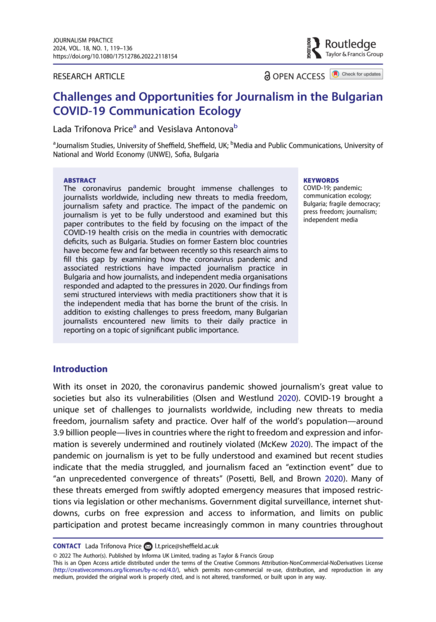 "The coronavirus pandemic brought immense challenges to journalists worldwide, including new threats to media freedom, journalism safety and practice. The impact of the pandemic on journalism is yet to be fully understood and examined but this paper contributes to the field by focusing on the impact of the COVID-19 health crisis on the media in countries with democratic deficits, such as Bulgaria. Studies on former Eastern bloc countries have become few and far between recently so this research aims to fill this gap by examining how the coronavirus pandemic and associated restrictions have impacted journalism practice in Bulgaria and how journalists, and independent media organisations responded and adapted to the pressures in 2020. Our findings from semi structured interviews with media practitioners show that it is the independent media that has borne the brunt of the crisis. In addition to existing challenges to press freedom, many Bulgarian journalists encountered new limits to their daily practice in reporting on a topic of significant public importance." (Abstract)