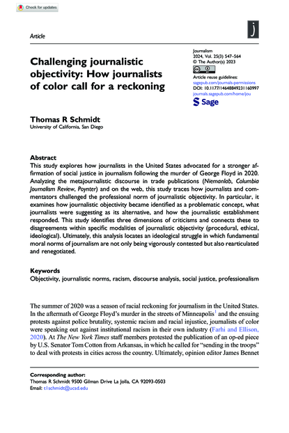 "This study explores how journalists in the United States advocated for a stronger affirmation of social justice in journalism following the murder of George Floyd in 2020. Analyzing the metajournalistic discourse in trade publications (Niemanlab, Columbia Journalism Review, Poynter) and on the web, this study traces how journalists and commentators challenged the professional norm of journalistic objectivity. In particular, it examines how journalistic objectivity became identified as a problematic concept, what journalists were suggesting as its alternative, and how the journalistic establishment responded. This study identifies three dimensions of criticisms and connects these to disagreements within specific modalities of journalistic objectivity (procedural, ethical, ideological). Ultimately, this analysis locates an ideological struggle in which fundamental moral norms of journalism are not only being vigorously contested but also rearticulated and renegotiated." (Abstract)