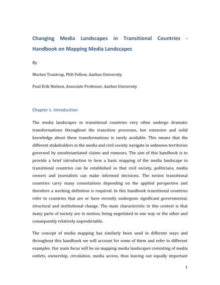 "The handbook is based on the authors’ varied experiences from consulting the implementation of media mappings in several transitional countries and it will focus on two of these projects: a. mapping the Mongolian media landscape initiated in 1999 ten years after the break down of Communism and b. the mapping of the Libyan media landscape initiated in 2012 one year after the Libyan revolution in 2011 and the ouster of Muammar Qaddafi. Developing on the experiences from these two projects and subsequent reflections the authors investigate why the Mongolian project was a success and still operating and in turn why the Libyan was far less successful despite similar methodological approaches. On the basis of these experiences the authors provide a description of a number of general circumstances that the authors recommend should be taken into account before and during the process of setting up a media mapping capacity." (IMS website)