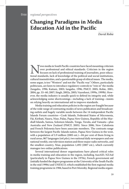 "Journalism education (based for most of the past three decades at three Pacific universities) and industry short-course training have followed different yet parallel paths in the region. Aid donors have played important roles in both sectors, although often not particularly well coordinated. While journalism education was being established in the region for the first time at the University of Papua New Guinea in 1975, media industry executives met to plan a strategy to boost on-the-job training and to defend themselves from growing pressures from post-colonial governments. The industry established the Pacific Islands News Association (PINA), which became a major regional media lobby group. Subsequently, the region’s state broadcasters broke away in 1988 to form a rival body, Pacific Islands Broadcasting Association (PIBA), and to establish the region’s first news cooperative, Pacnews. For a brief three-year period between 1988 and 1991, the university journalism education sector and industry training managed reasonable cooperation under UNESCO’s Pacjourn project. During this time, UPNG hosted Pacjourn and its staff of media academics and trainers ran short-courses for the benefit of the media industry. The focus then swung back to Fiji with a new UNESCO project leading to the establishment of the PINA-initiated Pacific Journalism Training Development Centre. While the UPNG Journalism Programme was funded initially by New Zealand aid, DWU was a private institution funded primarily by the Catholic Church and staffed mainly by volunteers. The degree programme founded at USP in the mid 1990s was funded by the French government for four years. In 1994, the Fiji media industry established a vocational training centre, the Fiji Journalism Institute (FJI), with UNESCO and other donor funding assistance along with the Fiji government, which provided office space. Although this venture collapsed after six years under a cloud over financial accountability, both the Fiji Media Council and PINA moved to revive the centre through the Fiji Institute of Technology. The Samoa Polytechnic (now the Samoa Institute of Technology) also established a vocational journalism school in 2002. Fiji has been the only Pacific country where the media industry has established a vocational programme competing with an established journalism school at a university—the region’s largest. This has prompted concerns about duplication and wastage of resources. AusAID, through its Pacific Media and Communications Facility and its associated Media in Development Initiative programme in Papua New Guinea, has gained ascendancy in the region as a media aid donor—and in most other fields, too. It has sought to achieve greater coordination in the region’s media training and aid cooperation between agencies. This also led to the merger of PINA and PIBA in 2004 for the benefit of the region. However, this trend has also led to growing concern in media and academic circles over a loss of independence and sovereignty over media training and educational policies—is aid a panacea or Pandora’s box for media training and education sustainability? It is critical for governance that future media training aid should have more transparency with funds being spread more evenly across several agencies so that no single industry group effectively holds too much power over journalism training policy. And the media should become proactive over reportage and debate over media aid issues and challenge conflicts of interest. Non-government organisations such as AusAID and the UN organisations need to tackle aid policy more robustly to push for a new funding paradigm in support of the Fourth Estate in the region in the digital age." (Conclusion)