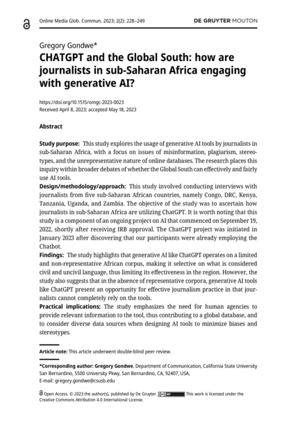 "The study highlights that generative AI like ChatGPT operates on a limited and non-representative African corpus, making it selective on what is considered civil and uncivil language, thus limiting its effectiveness in the region. However, the study also suggests that in the absence of representative corpora, generative AI tools like ChatGPT present an opportunity for effective journalism practice in that journalists cannot completely rely on the tools. Practical implications: The study emphasizes the need for human agencies to provide relevant information to the tool, thus contributing to a global database, and to consider diverse data sources when designing AI tools to minimize biases and stereotypes." (Abstract)
