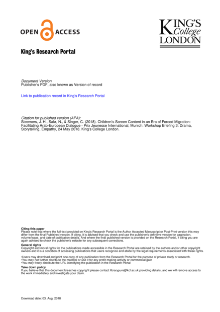 "This briefing summarises the proceedings of the third workshop in a project to stimulate dialogue between European and Arab stakeholders about European screen content for young children of Arab heritage who are living in Europe through forced migration." (Page 28)