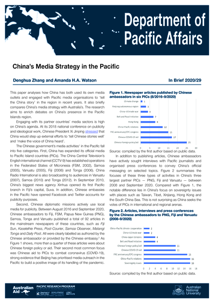 "The Chinese government’s media activities in the Pacific fall into five categories. First, China has expanded its official media to Pacific Island countries (PICs). The China Central Television’s English international channel (CCTV-9) has established operations in the Federated States of Micronesia (FSM, 2002), Samoa (2005), Vanuatu (2005), Fiji (2006) and Tonga (2006). China Radio International is also broadcasting to audiences in Vanuatu (2007), Samoa (2010) and Tonga (2012). In September 2010, China’s biggest news agency Xinhua opened its first Pacific branch in Fiji’s capital, Suva. In addition, Chinese embassies in the Pacific have opened Facebook and Twitter accounts for publicity purposes. Second, Chinese diplomatic missions actively use local media for publicity [...] China’s three other types of media activities include sponsoring Pacific journalists’ visits to China for training or exchanges, constructing media facilities and fostering ties with local Chinese media in PICs. For example, Pacific journalists attended capacity training programs in China in August 2015, October 2016 and June 2018. In March 2019, China funded the construction of the press gallery in Fiji’s parliament. Chinese embassies have also made efforts to establish close relations with Fiji Daily, the country’s largest newspaper in Mandarin Chinese, and Vila Times, the first Chinese-English bilingual newspaper in Vanuatu. In March 2018, Chinese ambassador to Fiji Qian Bo encouraged Fiji Daily to play its role in ‘telling the China story well’ in Fiji and contribute to China–Fiji relations." (Pages 1-2)