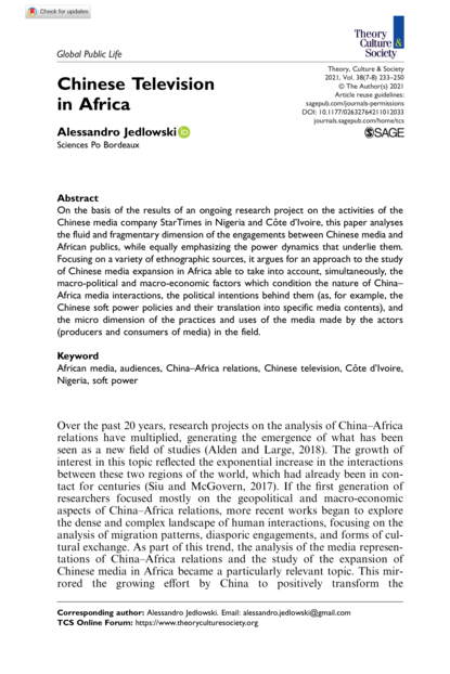 "On the basis of the results of an ongoing research project on the activities of the Chinese media company StarTimes in Nigeria and Côte d' Ivoire, this paper analyses the fluid and fragmentary dimension of the engagements between Chinese media and African publics, while equally emphasizing the power dynamics that underlie them. Focusing on a variety of ethnographic sources, it argues for an approach to the study of Chinese media expansion in Africa able to take into account, simultaneously, the macro-political and macro-economic factors which condition the nature of China–Africa media interactions, the political intentions behind them (as, for example, the Chinese soft power policies and their translation into specific media contents), and the micro dimension of the practices and uses of the media made by the actors (producers and consumers of media) in the field." (Abstract)