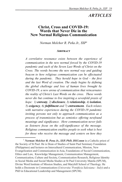 "A correlative resonance exists between the experience of communication in the new normal forced by the COVID-19 pandemic and each of the Seven Last Words of Christ on the Cross. The words become the new normal way and guiding beacon to how religious communication can be effectuated during the pandemic. They herald hope in God – the first and the last Word of creation. The study begins by defining the global challenge and loss of human lives brought by COVID-19, a new arena of communication that reincarnates the reality of Christ’s Last Words on the cross. These words never die but continue to live inspiring a sevenfold praxis of hope: 1) entreaty, 2) disclosure, 3) relationship, 4) isolation, 5) exigency, 6) fulfillment and 7) entrustment. Each relates with narrative experiences during the COVID-19 pandemic inviting persons not only to approach communication as a process of transmission but as semiotics offering newfound meanings and significance. Here communication never fails as listeners focus on the self-significance of the message. Religious communication enables people to seek what is best for those who receive the message and centers on how they could grow not only in faith but likewise as human beings who bear God’s image and likeness also in the time of the pandemic." (Abstract)