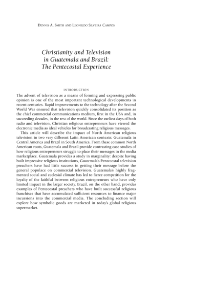 "This article will describe the impact of North American religious television in two very different Latin American contexts: Guatemala in Central America and Brazil in South America. From these common North American roots, Guatemala and Brazil provide contrasting case studies of how religious entrepreneurs struggle to place their messages in the media marketplace. Guatemala provides a study in marginality: despite having built impressive religious institutions, Guatemala’s Pentecostal television preachers have had little success in getting their message before the general populace on commercial television. Guatemala’s highly fragmented social and ecclesial climate has led to fierce competition for the loyalty of the faithful between religious entrepreneurs who have only limited impact in the larger society. Brazil, on the other hand, provides examples of Pentecostal preachers who have built successful religious franchises that have accumulated sufficient resources to finance major incursions into the commercial media. The concluding section will explore how symbolic goods are marketed in today’s global religious supermarket." (Introduction, page 49)