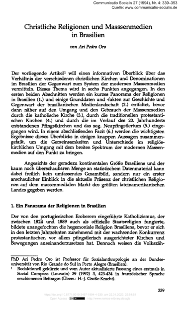 "Der vorliegende Artikel will einen informativen Überblick über das Verhältnis der verschiedenen christlichen Kirchen und Denominationen im Brasilien der Gegenwart zum System der modernen Massenmedien vermitteln. Dieses Thema wird in sechs Punkten angegangen. In den ersten beiden Abschnitten werden ein kurzes Panorama der Religionen in Brasilien (1) und einige Grunddaten und -fakten zur Geschichte und Gegenwart der brasilianischen Medienlandschaft (2) entfaltet, bevor dann näher auf den Umgang und den Gebrauch der Massenmedien durch die katholische Kirche (3), durch die traditionellen protestantischen Kirchen (4) und durch die im Verlauf des 20. Jahrhunderts entstandenen Pfingstkirchen und das sog. Neupfingstlertum (5) eingegangen wird. In einem abschließenden Fazit (6.) werden die wichtigsten Ergebnisse dieses Uberblicks in einigen knappen Aussagen zusammengefaßt, um die Gemeinsamkeiten und Unterschiede im religiöskirchlichen Umgang mit dem breiten Spektrum der modernen Massenmedien auf den Punkt zu bringen. Angesichts der geradezu kontinentalen Größe Brasiliens und der kaum noch überschaubaren Menge an statistischem Datenmaterial kann dabei freilich kein umfassendes Gesamtbild, sondern nur ein erster anschaulicher Einblick in die aktuelle Präsenz der christlichen Religionen auf dem massenmedialen Markt des größten lateinamerikanischen Landes gegeben werden." (Seite 339)