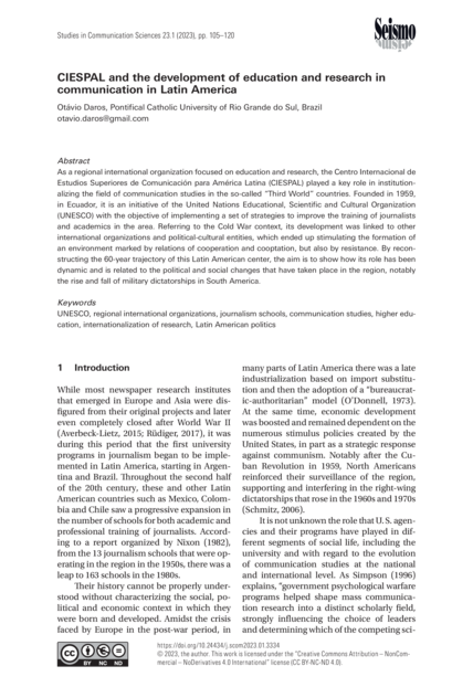 "As a regional international organization focused on education and research, the Centro Internacional de Estudios Superiores de Comunicación para América Latina (CIESPAL) played a key role in institutionalizing the field of communication studies in the so-called “Third World” countries. Founded in 1959, in Ecuador, it is an initiative of the United Nations Educational, Scientific and Cultural Organization (UNESCO) with the objective of implementing a set of strategies to improve the training of journalists and academics in the area. Referring to the Cold War context, its development was linked to other international organizations and political-cultural entities, which ended up stimulating the formation ofan environment marked by relations of cooperation and cooptation, but also by resistance. By reconstructing the 60-year trajectory of this Latin American center, the aim is to show how its role has been dynamic and is related to the political and social changes that have taken place in the region, notably the rise and fall of military dictatorships in South America." (Abstract)