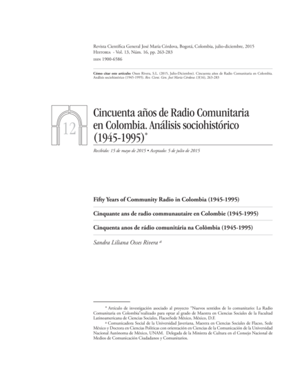 "Bajo el nombre de Radio Comunitaria se agrupan experiencias de diversa índole que se insertan en contextos urbanos y rurales de Colombia, caracterizados por altos niveles de marginación y exclusión de las dinámicas sociales, económicas, políticas y culturales del país. Se trata de cientos de experiencias que son mucho más que un simple correlato de la situación de violencia, desigualdad y crisis generalizada que hoy protagoniza este país. Pensar la Radio Comunitaria como proceso histórico y social fue el primer paso de una investigación que se propuso contestar el interrogante de ¿Cómo se ha transformado la definición y el sentido de lo comunitario en la Radio Comunitaria en Colombia, desde sus antecedentes hasta su actual resurgimiento? En el presente artículo presentamos los resultados del análisis sociohistórico realizado en el marco de un trabajo más amplio. La periodización propuesta obedece a las dinámicas que marcaron las rupturas y continuidades en las concepciones prevalecientes desde la década del cincuenta, en la que surge Radio Sutatenza como primer referente histórico de la Radio Comunitaria en Colombia, hasta su “resurgimiento”en la primera mitad de la década de los noventa." (Resumen)