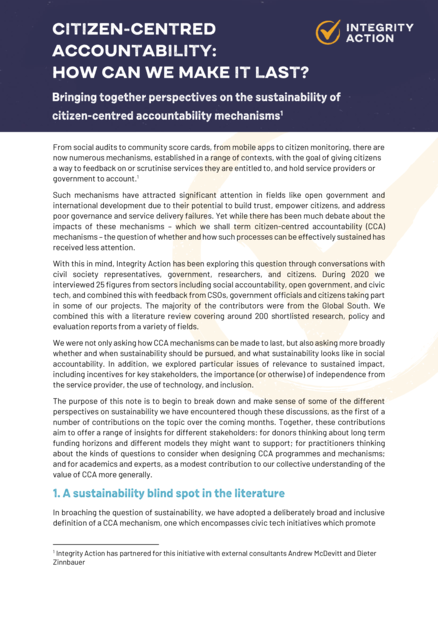"[...] Integrity Action has been exploring this question through conversations with civil society representatives, government, researchers, and citizens. During 2020 we interviewed 25 figures from sectors including social accountability, open government, and civic tech, and combined this with feedback from CSOs, government officials and citizens taking part in some of our projects. The majority of the contributors were from the Global South. We combined this with a literature review covering around 200 shortlisted research, policy and evaluation reports from a variety of fields. We were not only asking how citizen-centred accountability (CCA) mechanisms can be made to last, but also asking more broadly whether and when sustainability should be pursued, and what sustainability looks like in social accountability. In addition, we explored particular issues of relevance to sustained impact, including incentives for key stakeholders, the importance (or otherwise) of independence from the service provider, the use of technology, and inclusion. The purpose of this note is to begin to break down and make sense of some of the different perspectives on sustainability we have encountered though these discussions, as the first of a number of contributions on the topic over the coming months. Together, these contributions aim to offer a range of insights for different stakeholders: for donors thinking about long term funding horizons and different models they might want to support; for practitioners thinking about the kinds of questions to consider when designing CCA programmes and mechanisms; and for academics and experts, as a modest contribution to our collective understanding of the value of CCA more generally." (Page 1)
