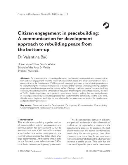 "By unearthing the connections between the literatures on participatory communica-tion and civic engagement with the reality of postconflict peace, this article demonstrates how a communication for development (C4D) approach to engaging citizens in peacebuilding contributes to strengthening the reconstruction process at the end of the violence, while engendering a bottom up process based on dialogue and inclusivity. After offering a brief overview of the peacebuilding contexts, this article presents a theoretical discussion that brings to the surface not only the role of C4D in facilitating citizens participation in government decision making, but also its significance in creating an inclusive peacebuilding process that starts from the community. At the same time, this discussion begins to shed light on the relationship between communication for development and participatory governance." (Abstract)