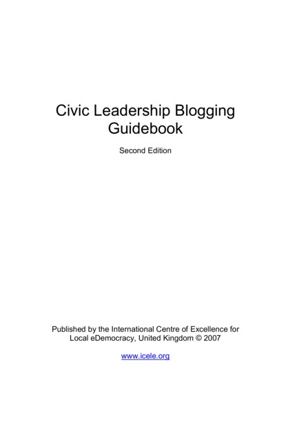 "This guide has been compiled from a number of sources, including industry experts on blogging, with a particular focus on civic leadership weblogging. Many of the examples are based on the experiences of a government-backed pilot into blogging in the public sector. The International Centre of Excellence for Local eDemocracy (ICELE) provides resources for local authorities concerning good practice in eDemocracy, and is a continuation of the Local eDemocracy National Project funded by the UK Government. This guide provides advice for civic leaders and councils regarding good practice in relation to the subject matter." (About this guidebook)