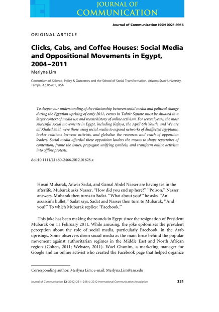 "To deepen our understanding of the relationship between social media and political change during the Egyptian uprising of early 2011, events in Tahrir Square must be situated in a larger context of media use and recent history of online activism. For several years, the most successful social movements in Egypt, including Kefaya, the April 6th Youth, and We are all Khaled Said, were those using social media to expand networks of disaffected Egyptians, broker relations between activists, and globalize the resources and reach of opposition leaders. Social media afforded these opposition leaders the means to shape repertoires of contention, frame the issues, propagate unifying symbols, and transform online activism into offline protests." (Abstract)