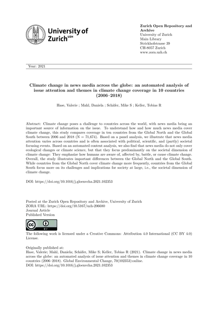 "Climate change poses a challenge to countries across the world, with news media being an important source of information on the issue. To understand how and how much news media cover climate change, this study compares coverage in ten countries from the Global North and the Global South between 2006 and 2018 (N = 71,674). Based on a panel analysis, we illustrate that news media attention varies across countries and is often associated with political, scientific, and (partly) societal focusing events. Based on an automated content analysis, we also find that news media do not only cover ecological changes or climate science, but that they focus predominantly on the societal dimension of climate change: They emphasize how humans are aware of, affected by, battle, or cause climate change. Overall, the study illustrates important differences between the Global North and the Global South. While countries from the Global North cover climate change more frequently, countries from the Global South focus more on its challenges and implications for society at large, i.e., the societal dimension of climate change." (Abstract)