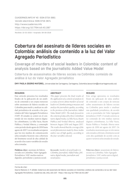 "Este artículo presenta los resultados finales de la aplicación de un análisis de contenido a un corpus noticioso sobre asesinatos de líderes sociales en Colombia para medir y analizar su calidad periodística de acuerdo a los postulados del Valor Agregado Periodístico (VAP). El estudio se centró en el contenido de tres medios nativos digitales colombianos, La Silla Vacía, Razón Pública y Verdad Abierta, y contempló como período desde agosto de 2016 hasta agosto de 2017. Los resultados arrojaron que los tres medios de comunicación seleccionados hicieron una cobertura del fenómeno social de alta calidad de acuerdo a las cuatro variables de estudio seleccionadas." (Resumen)