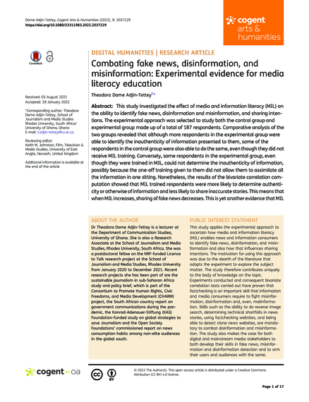 "This study investigated the effect of media and information literacy (MIL) on the ability to identify fake news, disinformation and misinformation, and sharing intentions. The experimental approach was selected to study both the control group and experimental group made up of a total of 187 respondents. Comparative analysis of the two groups revealed that although more respondents in the experimental group were able to identify the inauthenticity of information presented to them, some of the respondents in the control group were also able to do the same, even though they did not receive MIL training. Conversely, some respondents in the experimental group, even though they were trained in MIL, could not determine the inauthenticity of information, possibly because the one-off training given to them did not allow them to assimilate all the information in one sitting. Nonetheless, the results of the bivariate correlation computation showed that MIL trained respondents were more likely to determine authenticity or otherwise of information and less likely to share inaccurate stories. This means that when MIL increases, sharing of fake news decreases. This is yet another evidence that MIL enables information consumers to make informed judgments about quality information. It is recommended that MIL is incorporated into mainstream educational modules and consistently revised to reflect the demands of the times. MIL programs must also consider how to effectively reach those without formal education. Actors within the information, communications, and media ecology must contribute to their quota in making information consumers more discerning with the right MIL sensitisation." (Abstract)