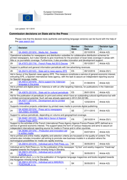 "A list of 30 EU member states' national media support projects between 2005 and 2018 "where the European Commission, after a preliminary examination, finds that no doubts are raised as to the compatibility with the common market of a notified measure, in so far as it falls within the scope of Article 87(1) of the EC Treaty." (commbox)